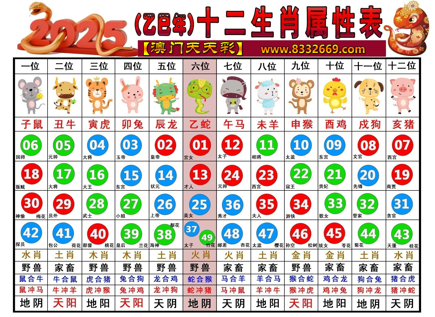 2025生肖: 01蛇 02龙 03兔 04虎 05牛 06鼠 07猪 08狗 09鸡 10猴 11羊 12马